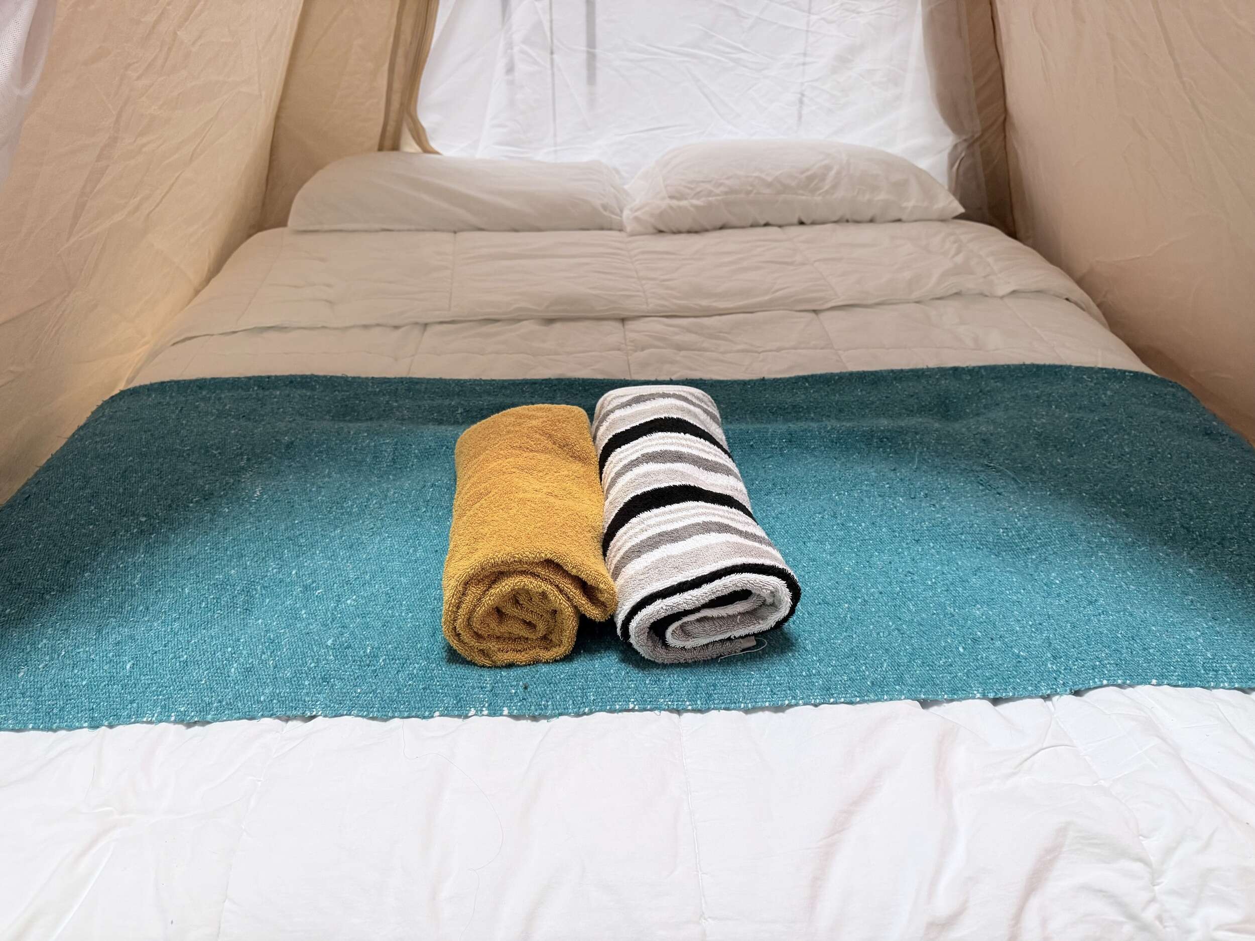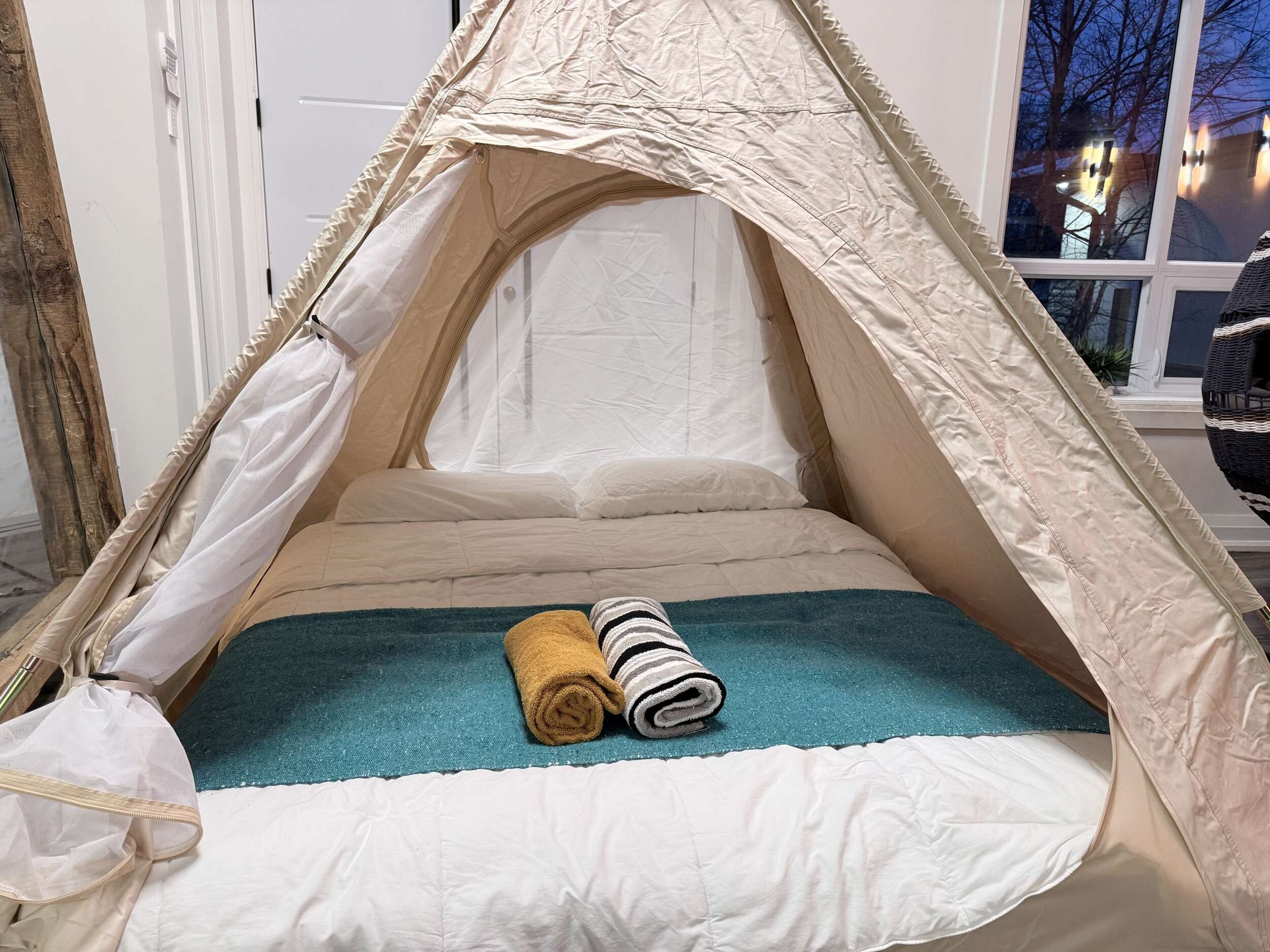 Pyramid Tent by Main Floor Garden for 1-2 Persons; Dual Doors; Walk out to the Front Balcony; Furnished with 1 Queen Mattress; Shared Washroom;