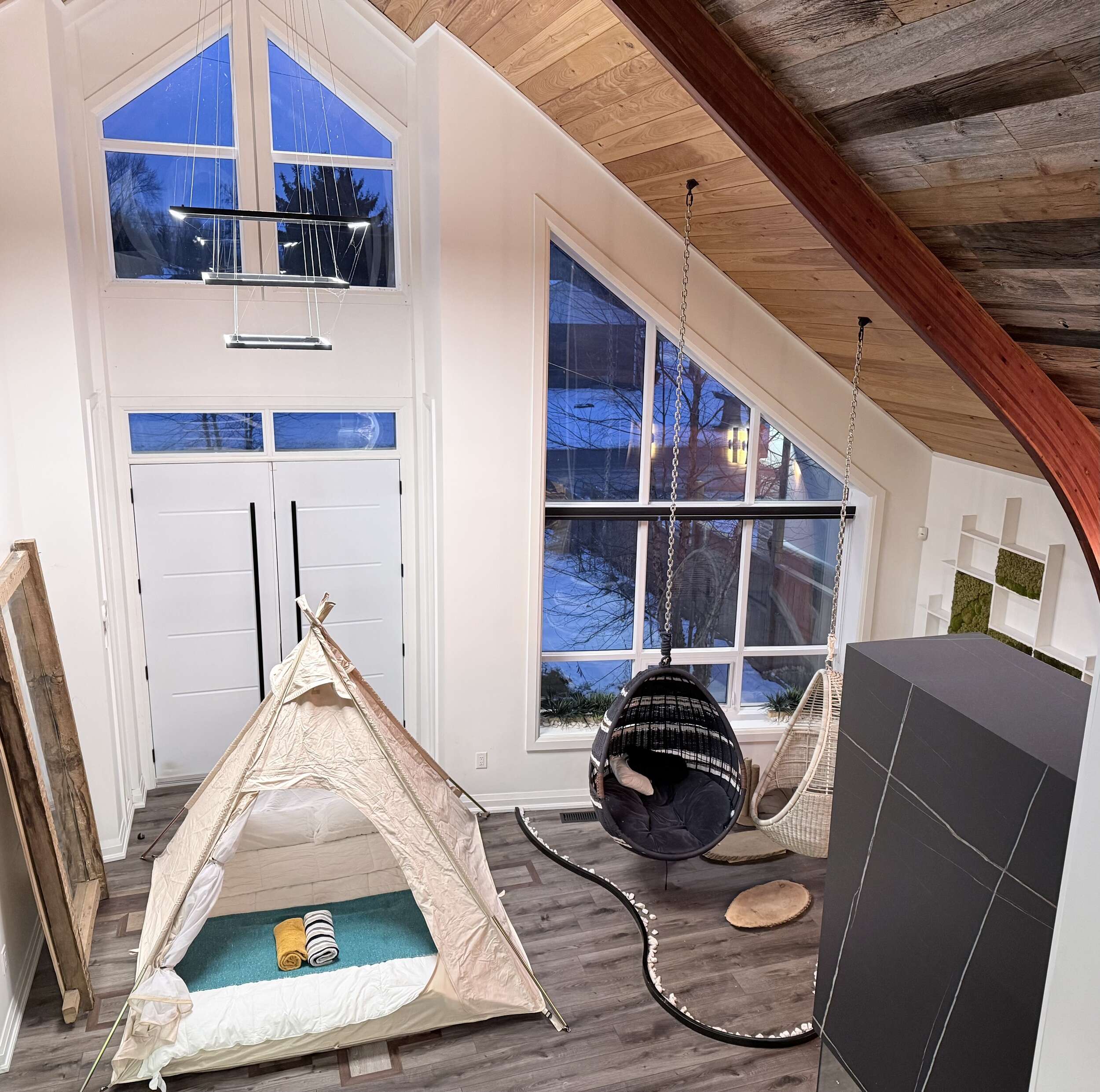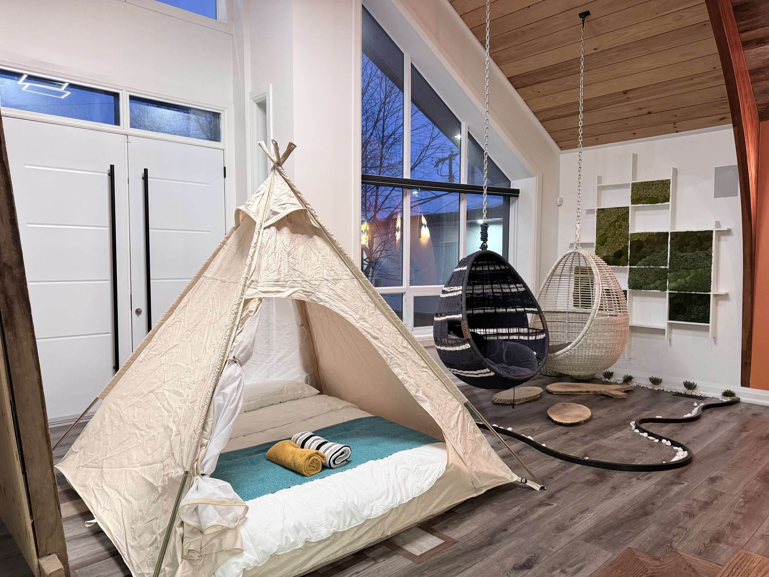 The B&B Wellness Accomodations welcome solo travelers, couples or groups within 18 People. The accommodations include 1) 1 Superior Master Suite with Spa Bath 2) 1 Modern King Room 3) 1 Deluxe Queen Room 4) Pyramid Tent by the Garden 5) Tent by the Davinci Fireplace 6) Tent by the “World is Yours” Art 7) Yurt on the Loft 8)Cave on the Loft 9) Tent on the Loft