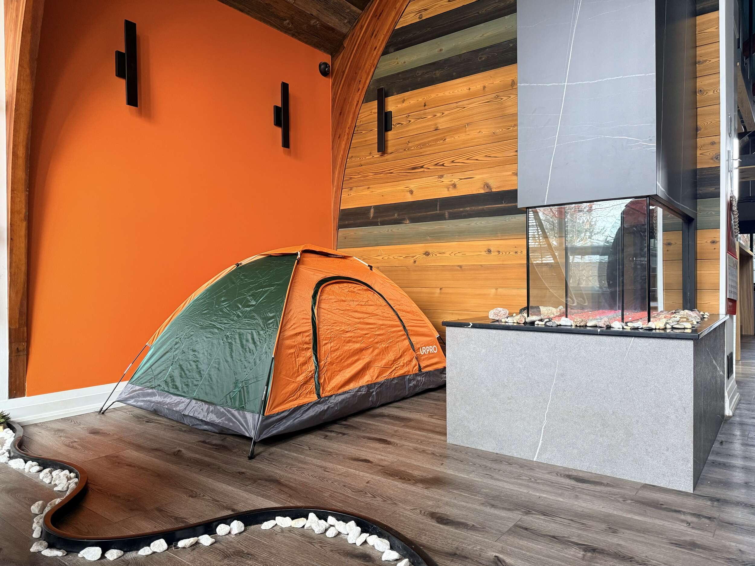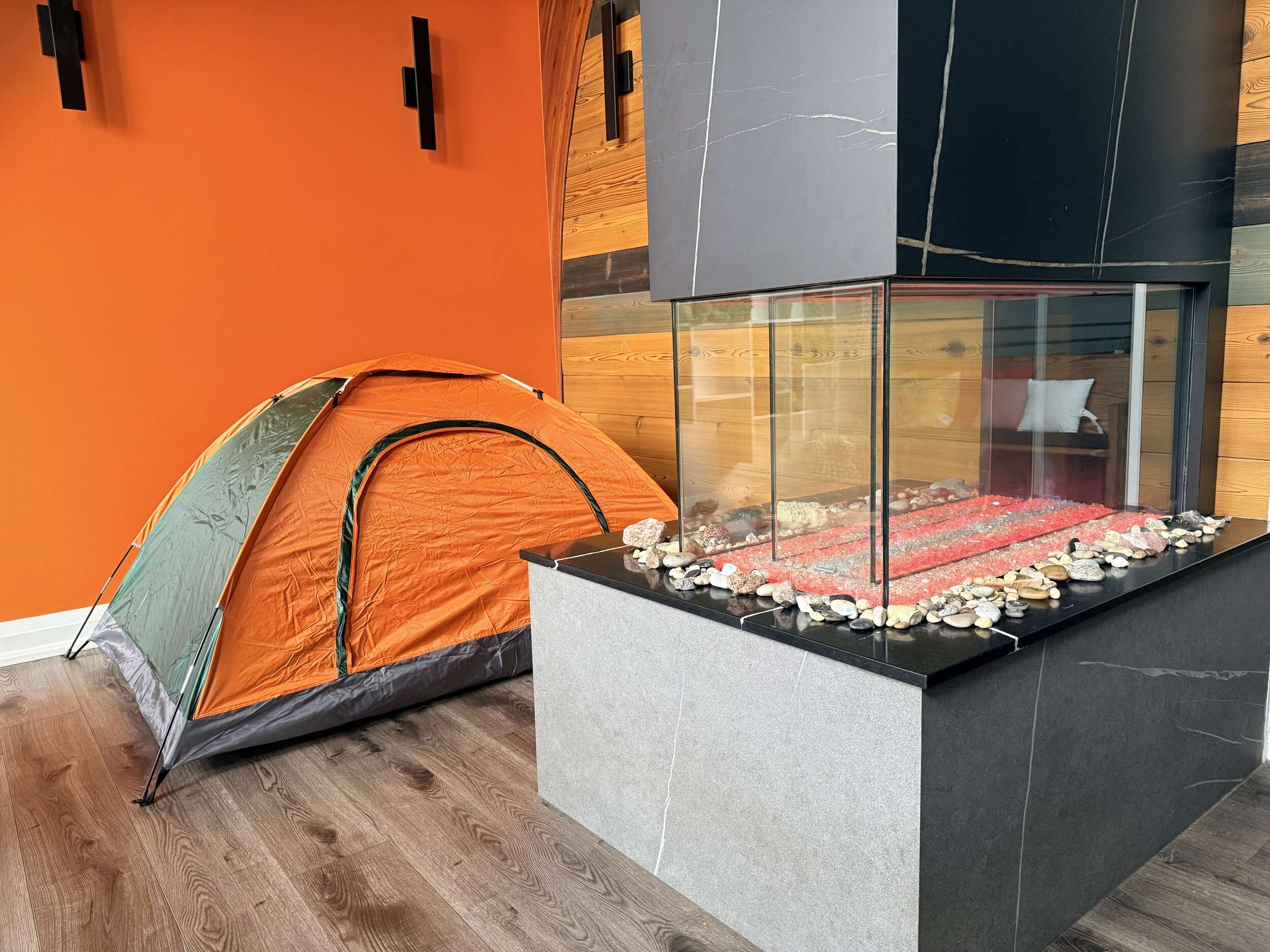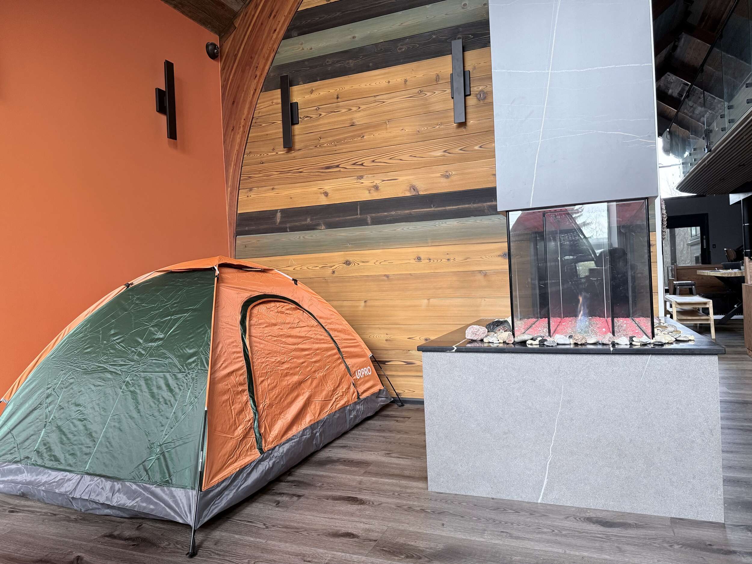 This Tent by Davinci Fireplace is for 1-2 Persons; Furnished with 1 Double Mattress; Shared Washroom;